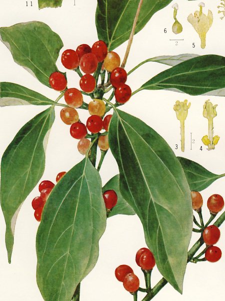 Leaves are alternate, gathered at the top of shoots, distinctly 3-nerved, glaucous and with silky hairs beneath.