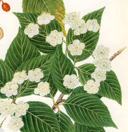 Leaves are alternate, duplicately serrate, deep green above, paler and glabrate beneath.