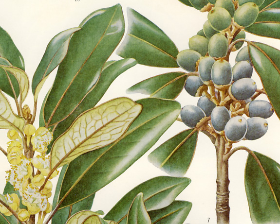 Leaves are alternate, coriaceous, entire and slightly recurved on the margin.