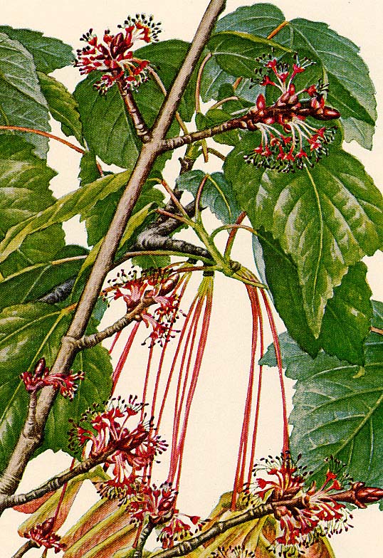 Red flowers open in April before leaves.