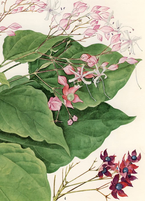 White flowers with 5-lobed reddish calyx open in August to September.