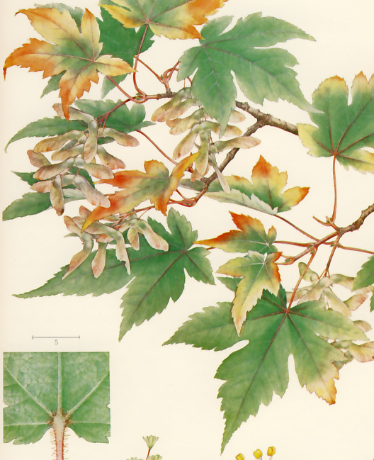 Leaves are decussately opposite, pentagonal, palmately 5-lobed, incisely and doubly serrate.