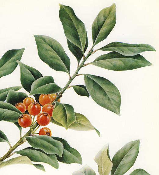 Leaves are alternate, entire, coriaceous, lustrous green above.