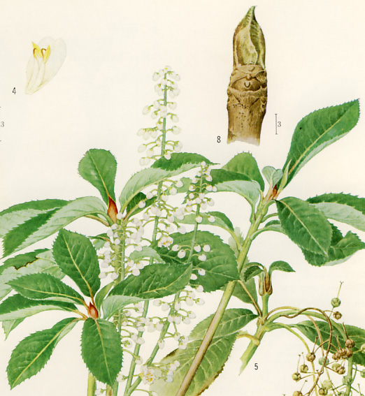Leaves are alternate, gathered toward the top of shoots, herbaceous, sharply serrate, green and glabrous above, paler beneath.