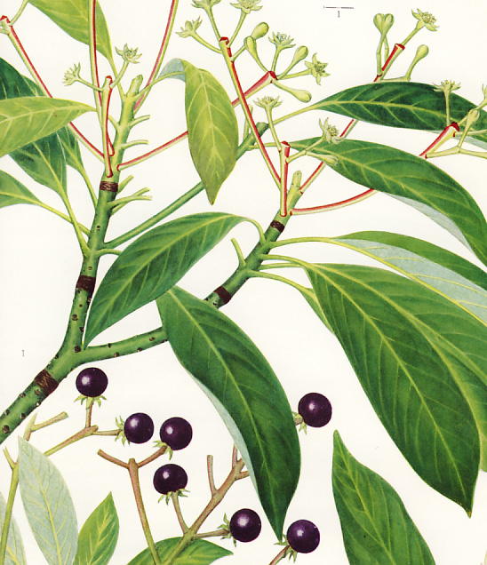Leaves are alternate, coriaceous, lustrous green above, whitish green beneath, with entire margin.