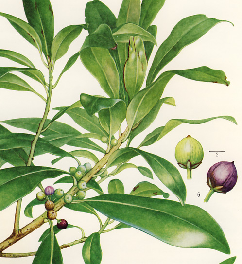 Leaves are alternate, coriaceous, oblanceolate, entire on the margin, obtuse at the apex, deep green and lustrous above, yellowish green and opaque beneath.
